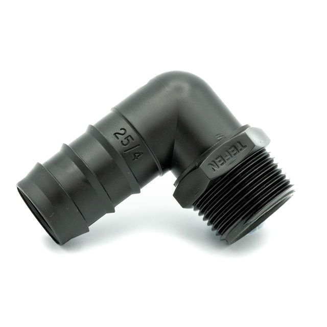 Tefen PP Black BSPT 1/2" Male Elbow Conn - Fits 25mm OD Hose